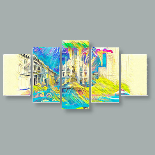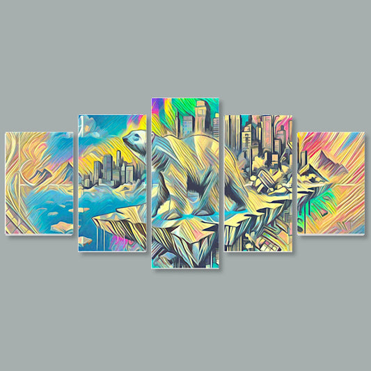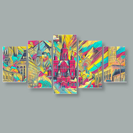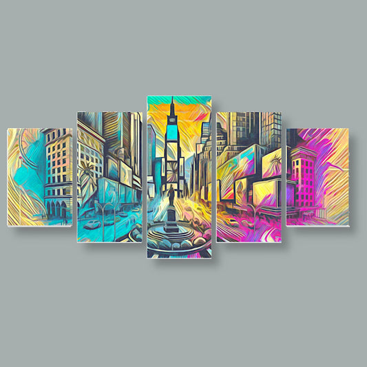 Benvenuti alla nostra collezione di tele composite. Queste opere d'arte presentano scene moderne e urbane divise in cinque pannelli. Sono perfette per chi ama i colori vivaci e i design dettagliati.