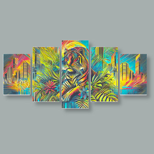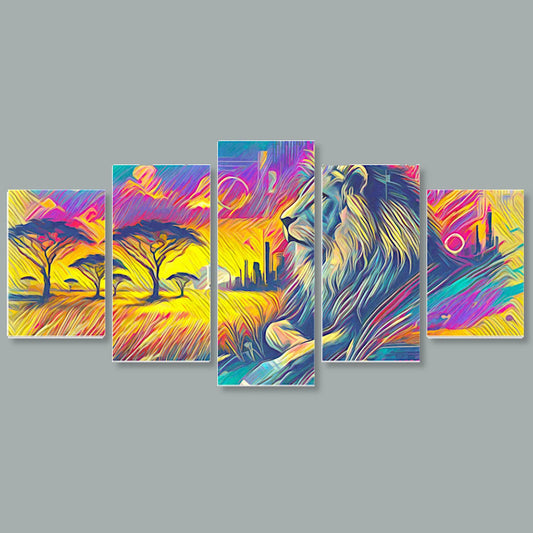 Tela 5 Pannelli Medium Telaio Leone: Natura e Maestà in Cinque Pannelli